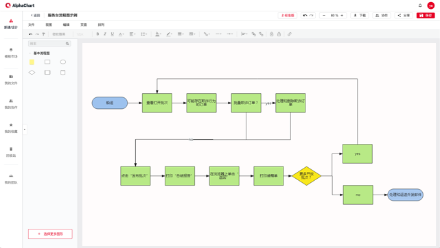 在AlphaChart中每個符號都是矢量的,可以填充顏色,改變大小,定義數據和連接。在流程圖標準符號包括4個基本流程符號橢圓形、矩形、箭頭、菱形和5類中高級的流程圖符號。通用流程圖